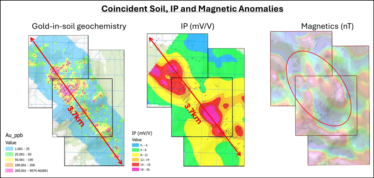 - Strongly anomalous soil geochemistry: copper (>300 ppm), gold (>200 ppb), and molybdenum (>12 ppm) over a 3.7 km strike length.